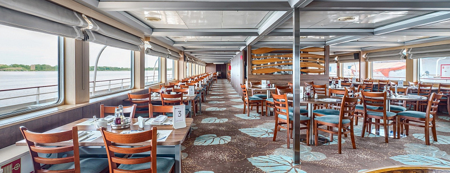 • Обед – заказная система питания (выбор блюд со 2-го дня круиза), фиксированная рассадка. Включённые напитки (без ограничения): вода, чай, кофе, морс.