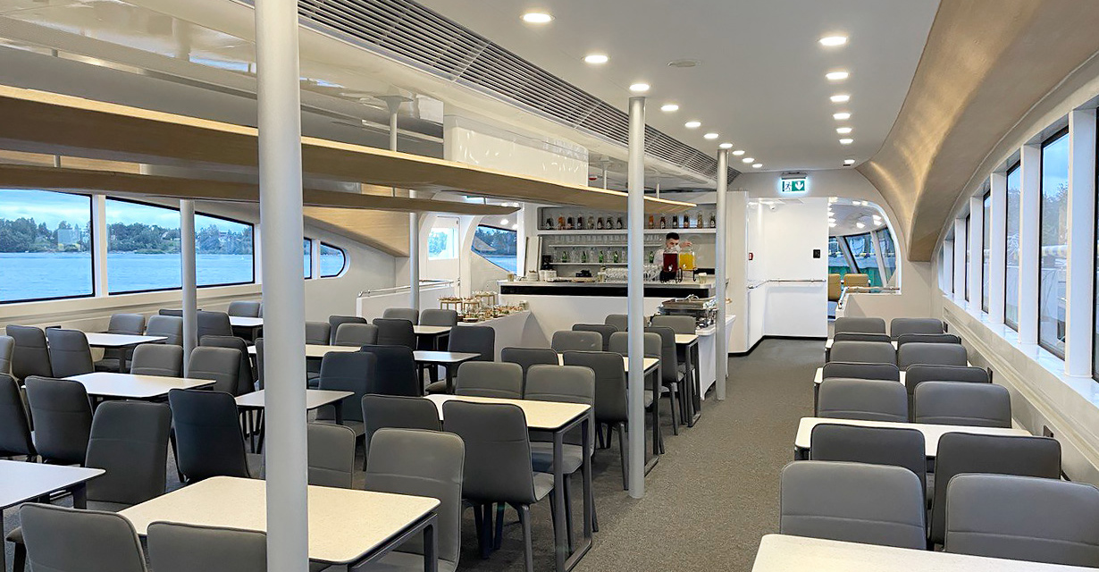 Комфортабельный двухпалубный катамаран «ЭкоходЪ» рассчитан на 130 пассажиров. На главной палубе расположен основной салон на 114 посадочных мест, в носовой части находится зона повышенной комфортности с панорамными окнами дополнительно на 16 пассажиров. Катамаран оборудован мягкими креслами и столиками. Салон может быть полностью трансформирован под любой формат мероприятия – мебель располагается под выбранный тип рассадки или убирается совсем.