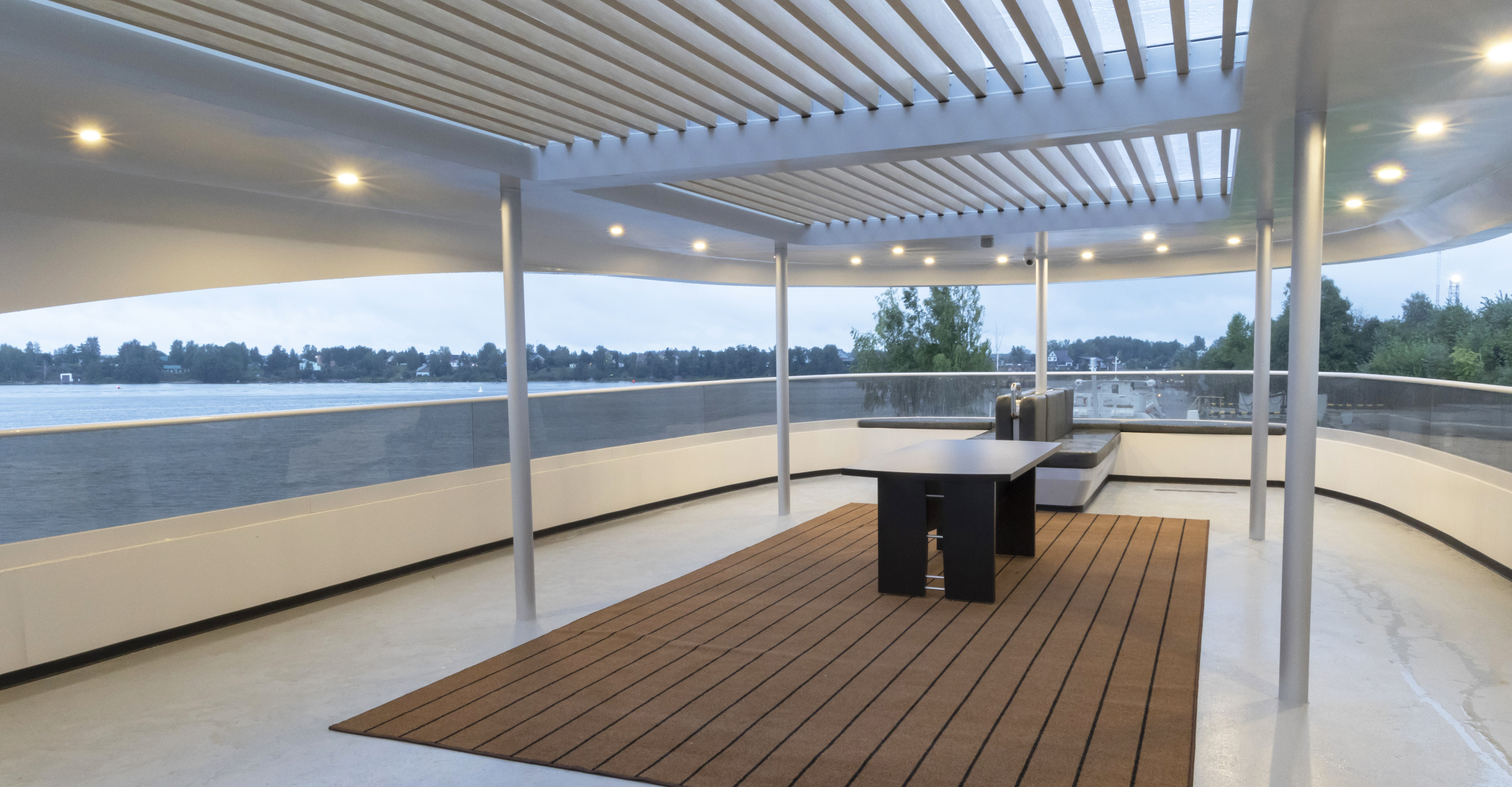 Для удобства гостей на борту имеются бар, кондиционер, розетки для зарядки гаджетов туалетные комнаты. В салоне доступна свободная мощность для подключения оборудования, так что во время мероприятия можно подключить проектор или экран, мультимедийную систему, дополнительное освещение, звук. Верхняя палуба частично открыта и защищена от осадков тентом для комфортных прогулок на свежем речном воздухе.