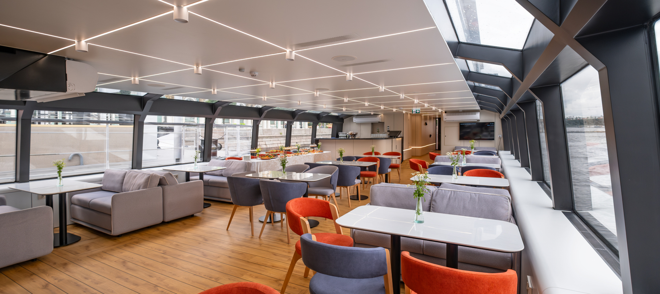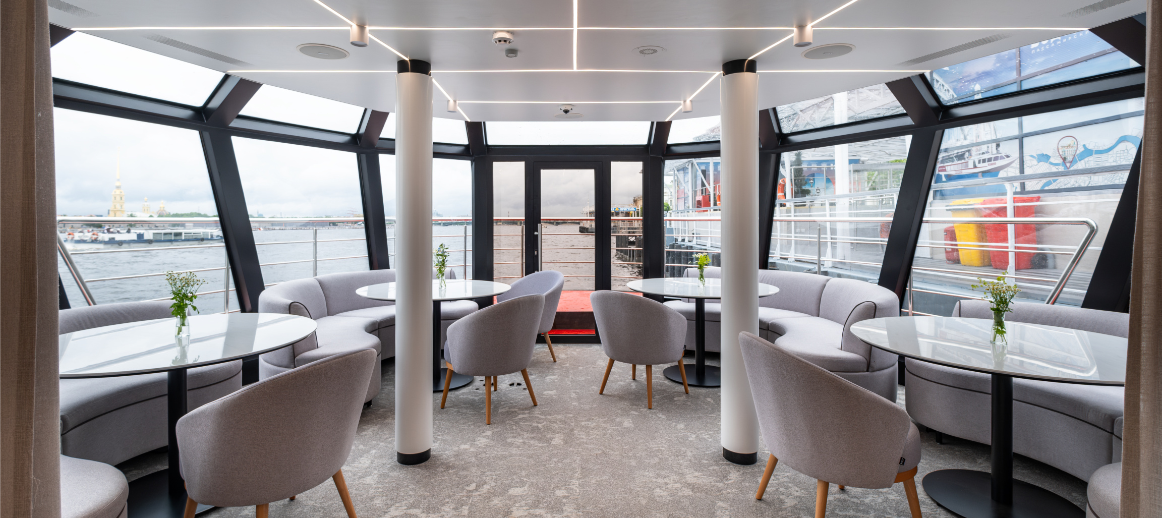 На борту электросудна «Стрельна» с удобством могут разместиться до 140 пассажиров. В основном салоне главной палубы располагается ресторан с баром, в носовой части - бизнес-зал с панорамными окнами. Верхняя палуба удобно разделена на открытую зону и закрытый панорамный салон.