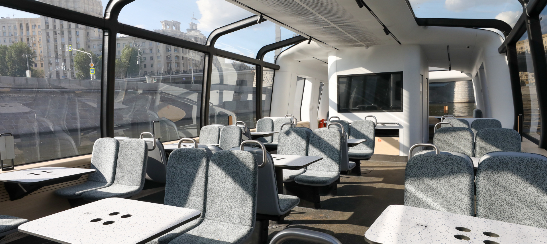 Новые бесшумные электросуда выполнены с учетом всех современных требований, начиная с «космического» дизайна в стиле минимализм и заканчивая надежными системами безопасности и автоматизации. Эргономичный салон судна вмещает до 50 пассажиров, включая не менее двух человек с ограниченными возможностями на индивидуальных средствах мобильности. Высокие потолки, панорамные окна и стеклянная крыша судна позволят любоваться московскими пейзажами круглый год. Мягкие кресла, столики с розетками и USB-портами, сплит-система, информационные панели, туалет, кулер с питьевой водой — все это обеспечивает комфортабельную транспортировку с возможностью камерного отдыха на воде. В носовой части судна расположена велопарковка, рассчитанная на три велосипеда или самоката, провоз включен в стоимость билета. Пассажиры с детьми могут взять с собой детскую коляску — в салоне судна для нее предусмотрено место.