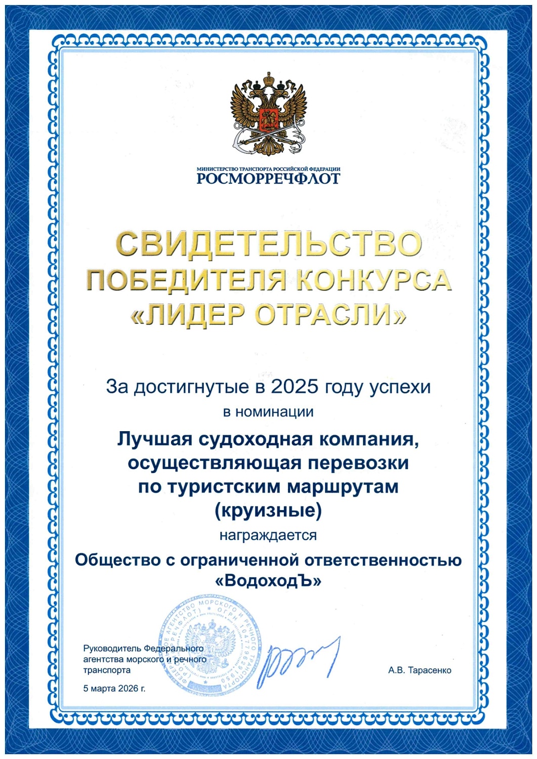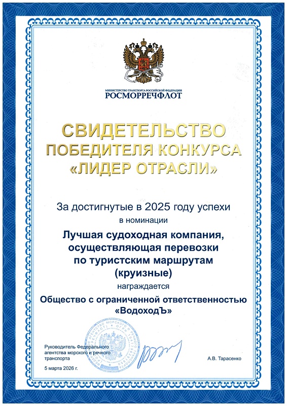 Победа в номинации "Лучший организатор круизных туров", премия Правительства Москвы "Путеводная звезда-2025"