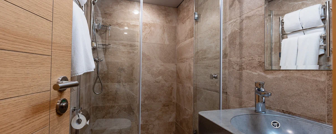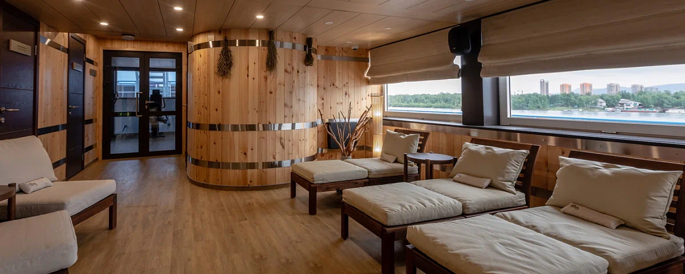 Теплоход – сам по себе был «точка для путешествия». Бары и рестораны, караоке, спа-центр с баней, сауной, соляной пещерой и хаммамом, где для процедур используют сборы сибирских трав, а для меня было главное – прекрасно оснащенный спортзал. Мне не хотелось пропустить ни одного часа из путешествия, поэтому часов в 7 утра я уже была на беговой дорожке и весь мой «беговой час» передо мной буквально «проплывали» сибирские берега, такие разные в своих трех климатических поясах. Те, кто занимался йогой и пилатесом на открытых палубах, тоже были в полном восторге от энергетики мест. А почему мы не хотели бросать спорт? Ответ прост…
