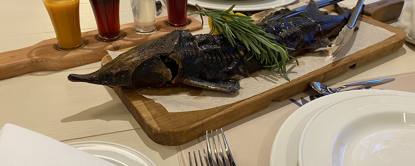 По дороге меню в ресторане менялось 4 раза и чего там только не было: таежные блюда, кухня народов севера, специалитеты сибирские. На минуточку: для почти 80 пассажиров готовят 13 поваров! Вспомнить могу не все, но точно были медальоны из оленины, строганина из северной рыбы, был муксун, нельма, стерлядь, хариус, сибирские лесные грузди, десерты из таежных ягод, еще что-то вкусное из папоротника. Что понравилось – если не ешь мяса или что-то безглютеновое хочешь, не проблема, можно заказать отдельное питание. Я решила попробовать и взяла «бифштекс без мяса», осталась очень довольна! Завтраки с разными «фантазийными» кашами были бесподобны, но, мой спутник больше предпочитал плотные «сибирские варианты» завтрака, в общем, довольны были все. А еще на борту проводятся фантастические гастроужины...