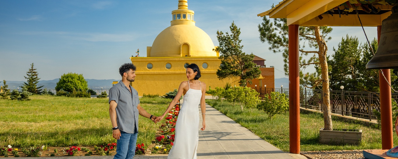 Есть здесь и огромная статуя Будды Шакьямуни, выполненная из бронзы и покрытая сусальным золотом. Шестиметровая фигура была изготовлена мастером Гу Шиюанем в Китае и привезена на место в разобранном виде. В постаменты спрятаны драгоценности и священные тексты «Ганджур» и «Данджур». В ходе прогулки вы встретите «Колокол Четырех Печатей» – самый большой буддийский колокол в России весом в семьсот килограммов, а также восемь буддийских ступ.