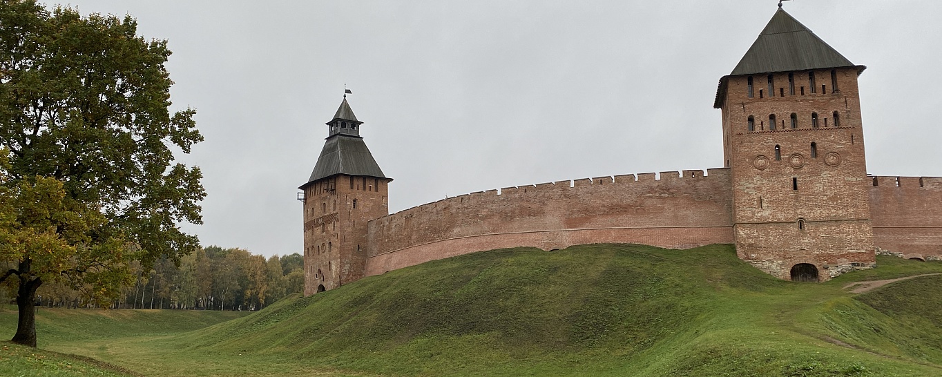 - Новгородский Кремль. Здесь его называют Детинец. Крепость на берегу реки Волхов впервые упоминается в летописях в 1044 г., это самый старый кремль в России. Стены и 9 башен, отлично сохранившиеся до наших дней, выложены из кирпича и камня в XIV-XV вв.