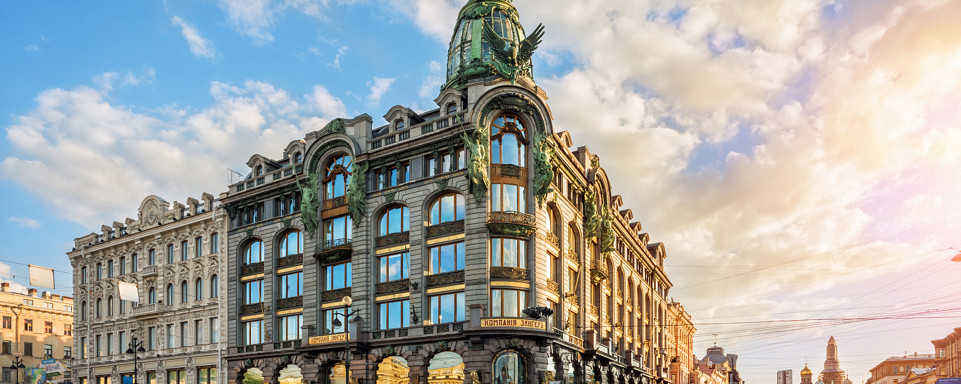 Шестиэтажное здание в стиле модерн, с башней, увенчанной стеклянным глобусом, сразу обращает на себя внимание изысканностью и гармонией линий. Этот дом был выстроен в 1902-1904 гг. для американской компании «Зингер», выпускающие знаменитые швейные машинки. Здание должно было соответствовать высокому статусу компании, поэтому на нем не экономили. Фасад с нестандартно большими окнами облицован гранитом трех цветов и украшен статуями и узорными решетками. Главная «изюминка» – башня-фонарь со стеклянным глобусом и подсветкой. Здание отличалось передовыми системами инженерных коммуникаций и роскошью интерьеров в стиле модерн: позолота, каррарский мрамор, красное дерево и прочее.