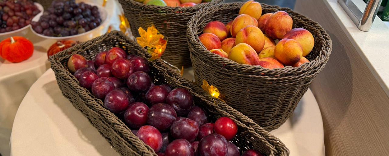 Щедрый осенний буфет с сезонными фруктами впечатлил туристов на теплоходе «Нижний Новгород». Сочные арбузы, спелые дыни, золотистые нектарины и не только предлагают гостям на завтраках по системе «шведский стол».