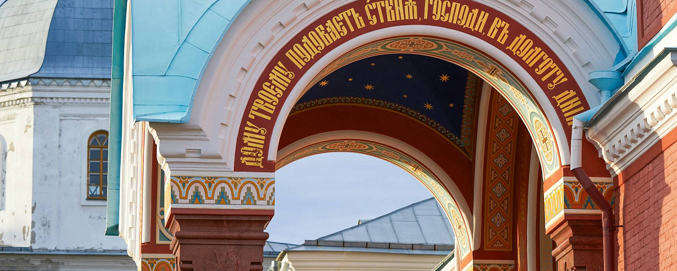 Надвратный храм встречает всех, ступающих на территорию монастыря. Построен он в честь первоверховных апостолов. Это важнейшая часть архитектурного комплекса внешнего каре усадьбы монастыря. Утраченную настенную живопись в нишах храма заменили современные золоченые иконы из мозаик. Над вратами размещена Иверская икона Божьей матери, которую часто именуют Вратарницей.