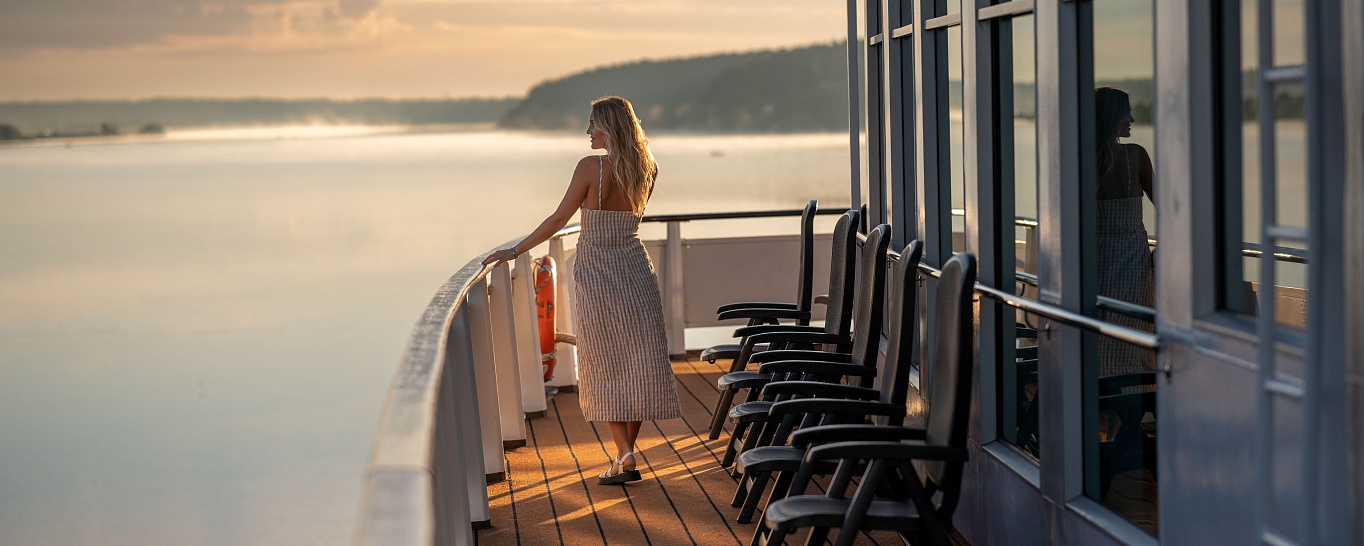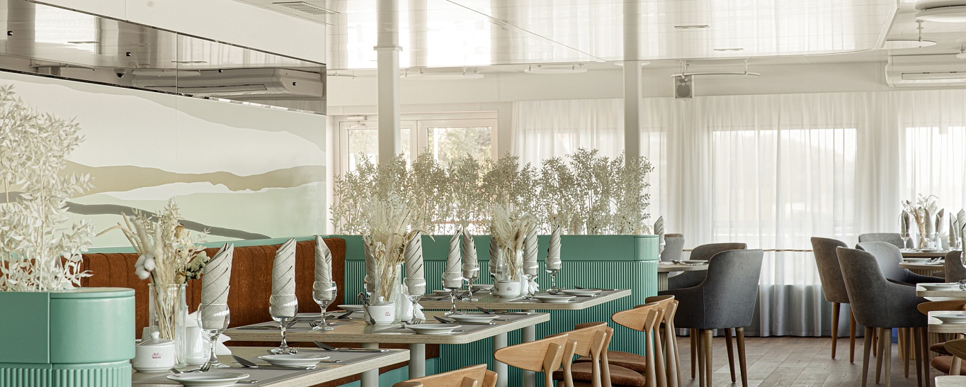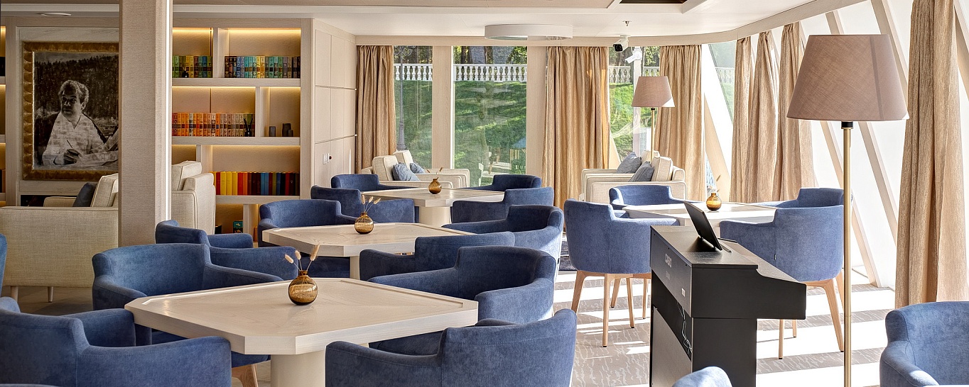 Благодаря лаконичному дизайну в скандинавском стиле в ресторанах, барах и других помещениях теплохода просторно и много света. Каюты продуманы до мелочей, в них уютно и комфортно, как в хорошем отеле. На солнечной палубе, оборудованной тентом, можно как загорать, так и отдыхать в тени. На борту также есть детская комната и массажный кабинет.