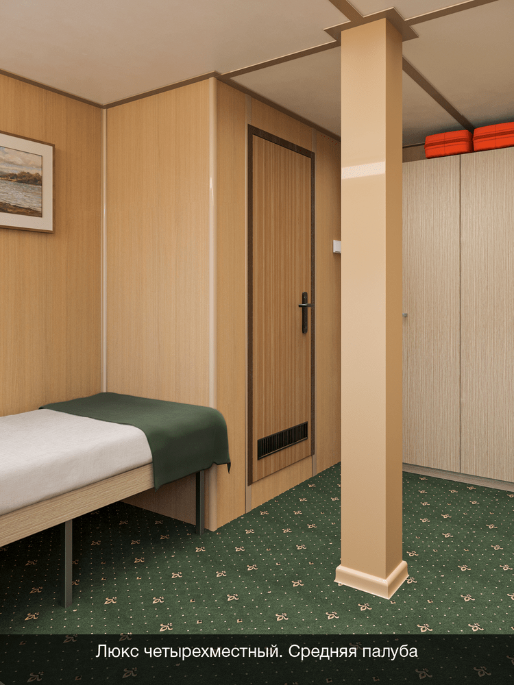 Двухкомнатный на средней палубе. Номер каюты: 119. Двухкомнатная каюта с удобствами (душ, санузел, кондиционер). Каюта рассчитана на размещение от двух до четырех человек. В гостиной: шкаф-стенка, двухместная кровать, телевизор, холодильник, радио, фен, два обзорных окна, электророзетка на 220V. В спальне: два спальных места (одно над другим), зеркало.
