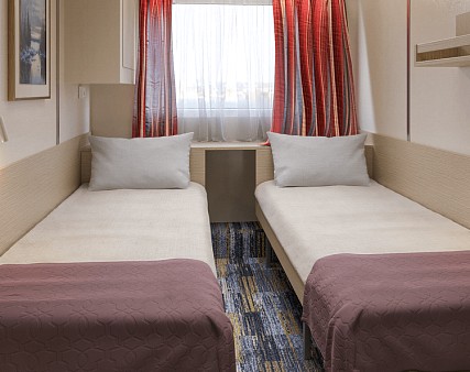 В каюте: два спальных места (одно над другим), шкаф для одежды, зеркало, радио, душ, санузел, кондиционер, обзорное окно, электророзетка на 220V.