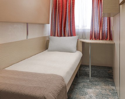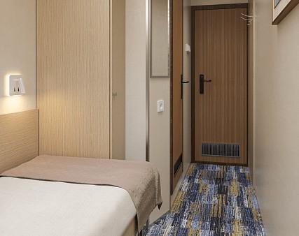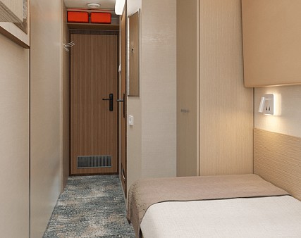 В каюте: одно спальное место, шкаф для одежды, радио, душ, санузел, кондиционер, обзорное окно, зеркало, электророзетка на 220V.