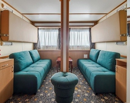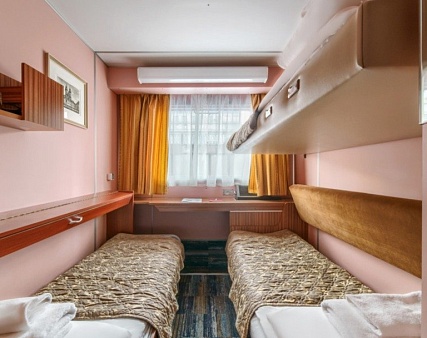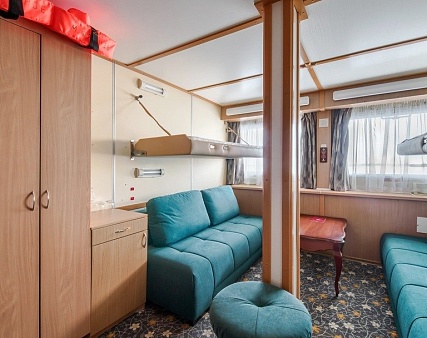 В каюте: два дивана-книжки (раскладываются), два спальных места вторым ярусом, два шкафа для одежды, зеркало, телевизор, холодильник, радио, фен, два обзорных окна, электророзетка на 220V.