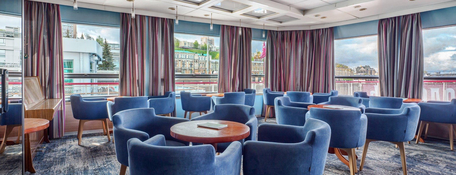В каюте: двуспальная кровать, кресло-кровать, шкаф для одежды, журнальный столик, телевизор, фен, кондиционер, холодильник, радио, душ, санузел, два обзорных окна, электророзетка на 220V.