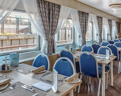 - Ужин — заказная система питания (выбор блюд со 2-го дня круиза). Включённые напитки (без ограничения): вода, чай, кофе, кисломолочный напиток (1 стакан 200 мл на ужин по запросу гостя). На выбор: вино красное / белое / игристое (1 бокал, 125 мл) / водка (1 рюмка, 50 мл) / пиво (1 бокал, 300 мл), домашний морс (1 бокал, 200 мл);