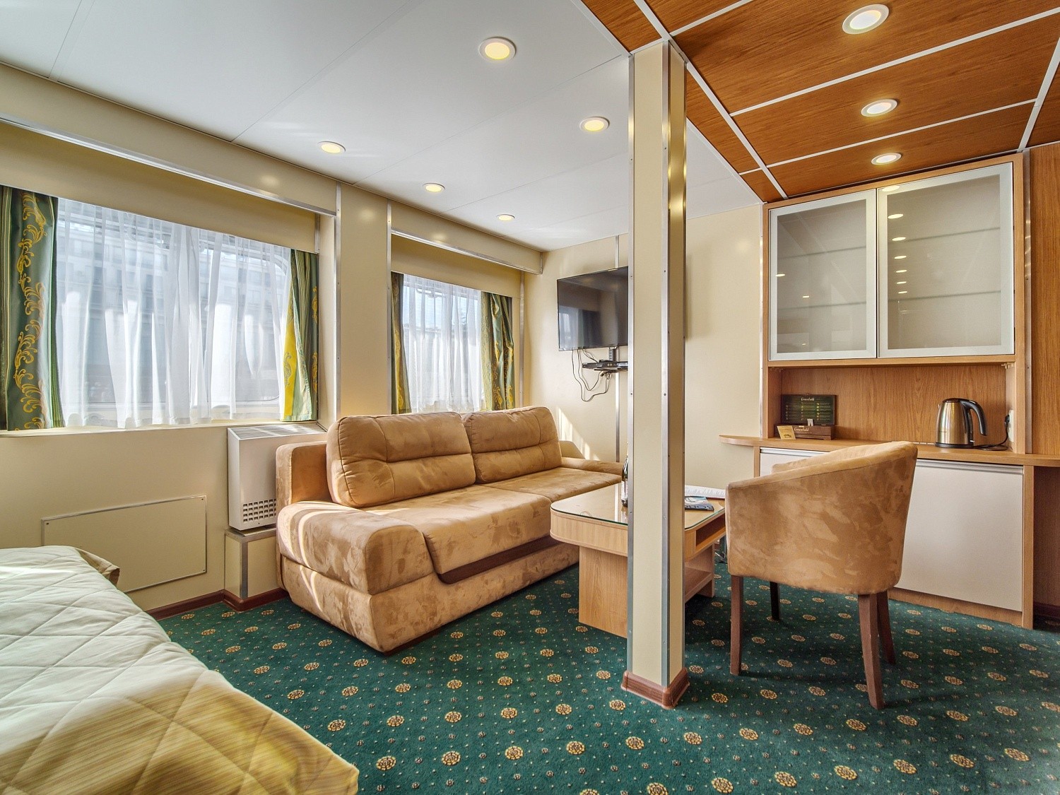 Просторная каюта с современным интерьером, мягкая мебель — диван, два кресла, двуспальная кровать, шкаф для одежды, телевизор c DVD, холодильник, радио, три обзорных окна, электророзетка на 220V, фен, кондиционер.