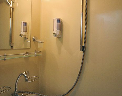 Далее сама каюта. У нас были стандартные двухместные одноярусные каюты. В общем и целом каюты обычные, ничего примечательного. Есть свой санузел, но душевой как таковой нет, просто душевая лейка, и весь санузел превращается в душевую, правда есть еще хлипкая  занавесочка. Но совершенно непонятно, как помыться, не облив полностью весь санузел, раковину, зеркало и т.д.  В самой каюте отсутствует столик между кроватями, что, конечно же, является большим минусом, так как даже чай при желании толком в каюте не попьешь. Что удивило, так это огромные щели между кроватью и стеной. Чтобы маленький ребёнок не упал в эту щель, пришлось затыкать дыры своими одеялами, в итоге взрослый остаётся без одеяла. При этом, как ни странно, дали детский ограничитель, чтобы с другой стороны кровати ребенок не свалился, за это спасибо. Кроме того, спать совершенно невозможно,  потому что постоянно чудовищно дребезжит оконное стекло в каюте. На наш вопрос персоналу, почему дребезжит окно и можно ли что-то сделать, недоуменно пожали плечами и сказали, что иначе окно  будет туго закрываться. Но оно, кстати, и так закрывалось с большим трудом, мы вдвоем его еле-еле закрыли. Между прочим, недоуменное пожатие плечами – это вообще фирменный стиль экипажа/персонала данного теплохода.
