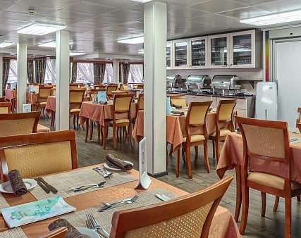 - Обед — заказная система питания (выбор блюд со 2-го дня круиза), фиксированная рассадка. Включённые напитки (без ограничения): вода, чай, кофе, морс (порционно);