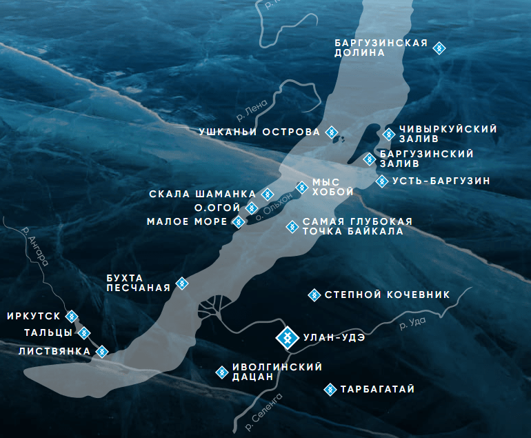 Улан-УдэИволгинский дацанТарбагатайУлан-Удэп. Усть-Баргузин (Бурятия)Баргузинский заливЧивыркуйский заливСамая глубокая точка БайкалаМыс ХобойМалое мореОльхонские воротаБухты Большого моряо. ОгойМыс Скала ШаманкаИркутскТальцыЛиствянкаИркутск