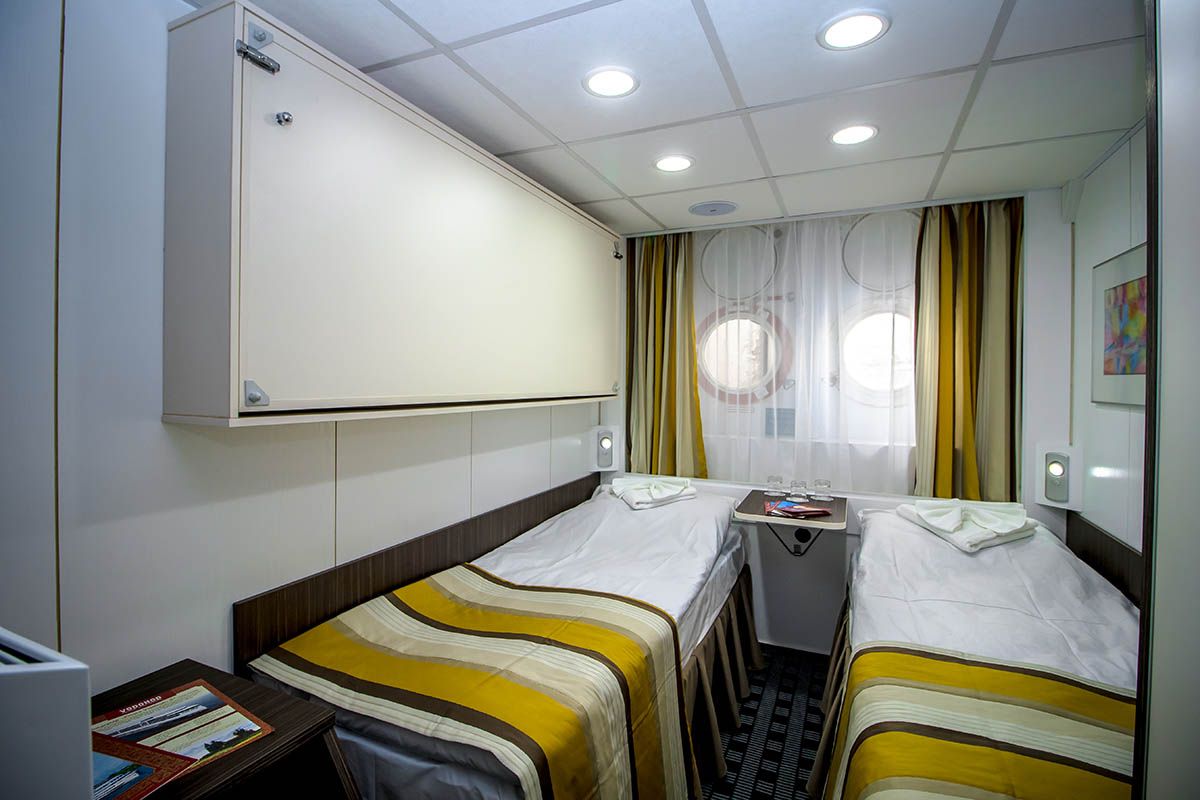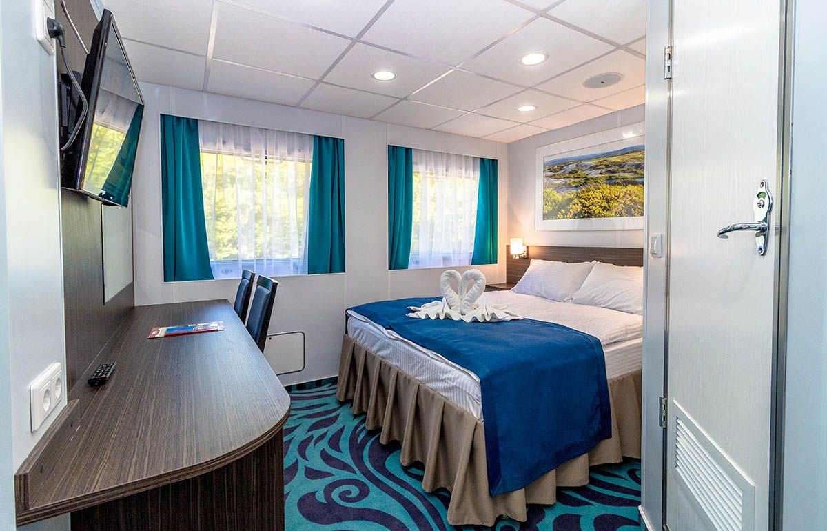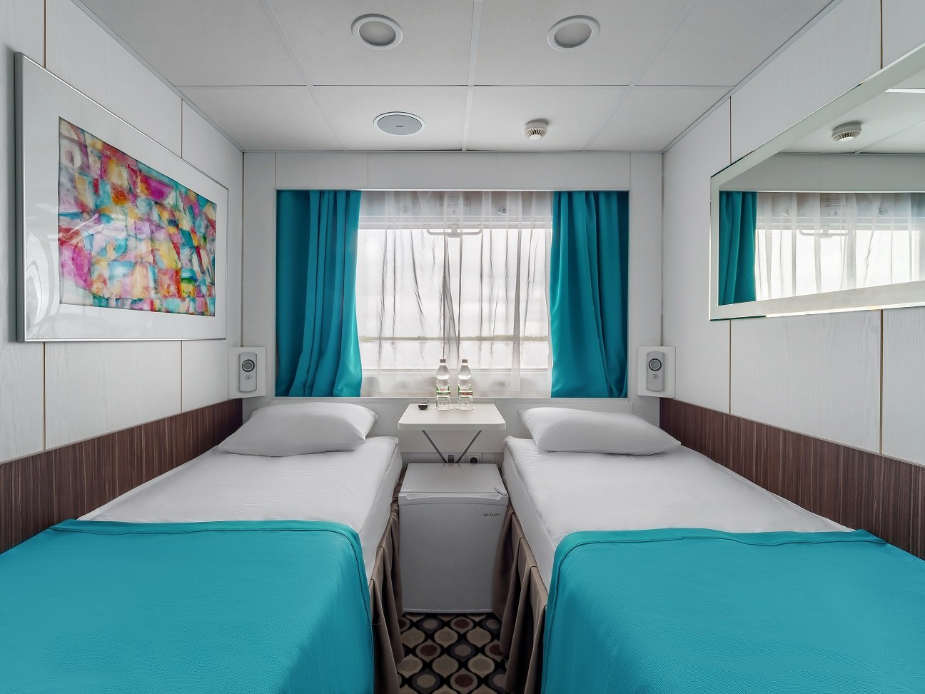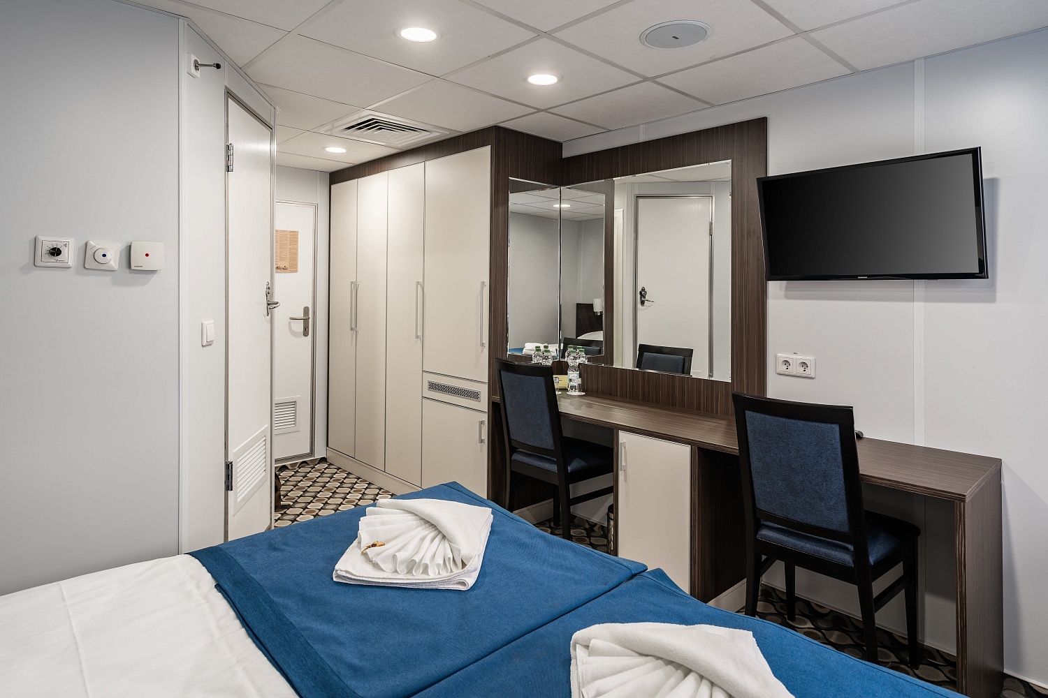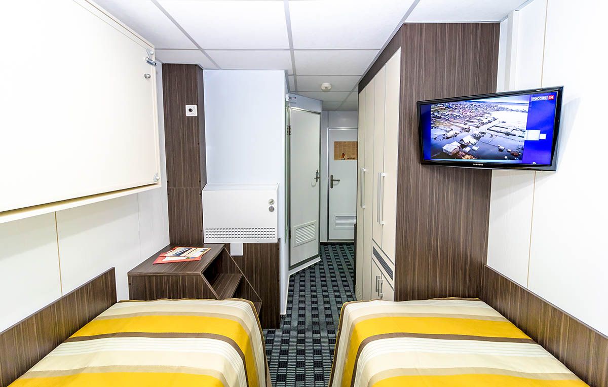 В каюте: две односпальные (сдвинуть нельзя) кровати, шкаф для одежды, трюмо, телевизор, холодильник, сейф, фен, радио, одно обзорное окно, электророзетка на 220V.