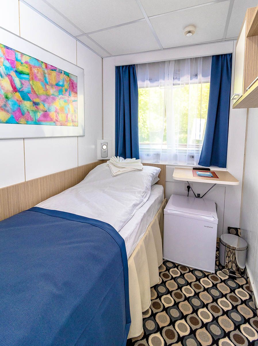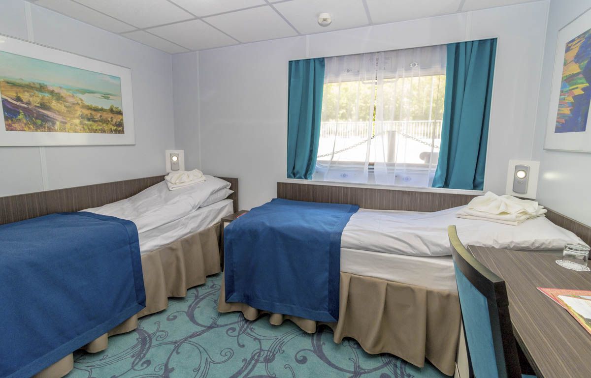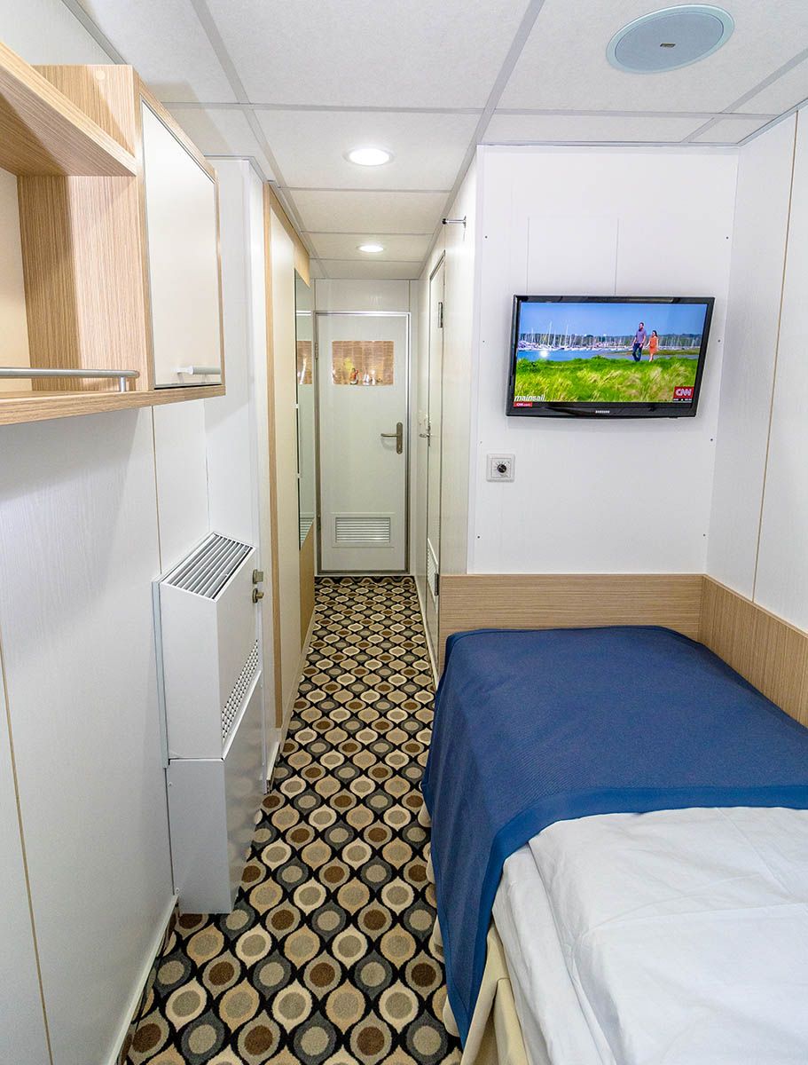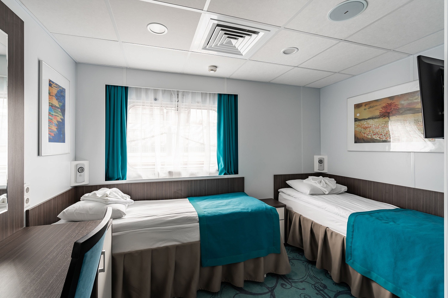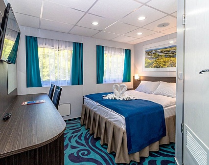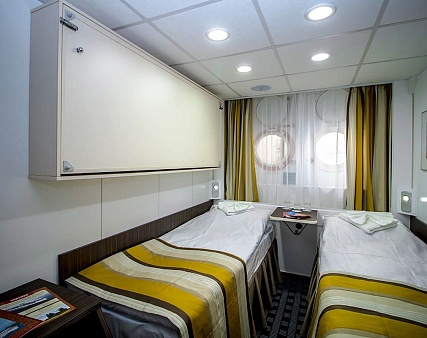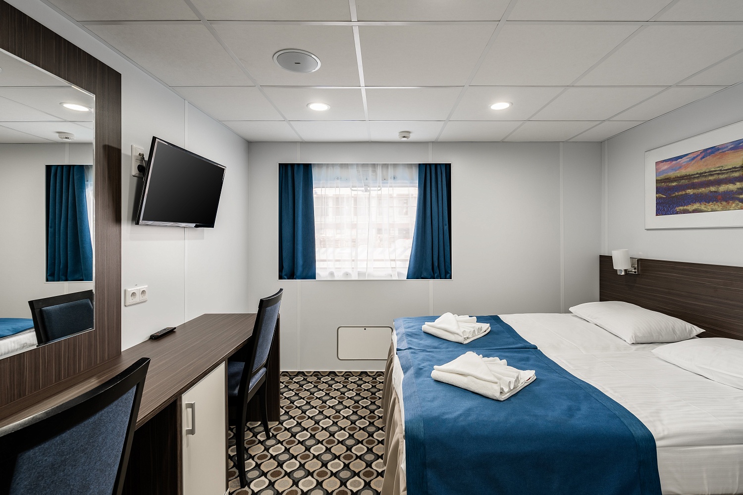 В каюте: две односпальные (сдвинуть нельзя) кровати, шкаф для одежды, трюмо, телевизор, холодильник, сейф, фен, радио, одно обзорное окно, электророзетка на 220V.