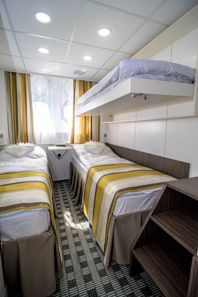 В каюте: три спальных места (два внизу, одно — вторым ярусом), шкаф для одежды, трюмо, радио, телевизор, холодильник, фен, сейф, обзорное окно, электророзетка на 220V.