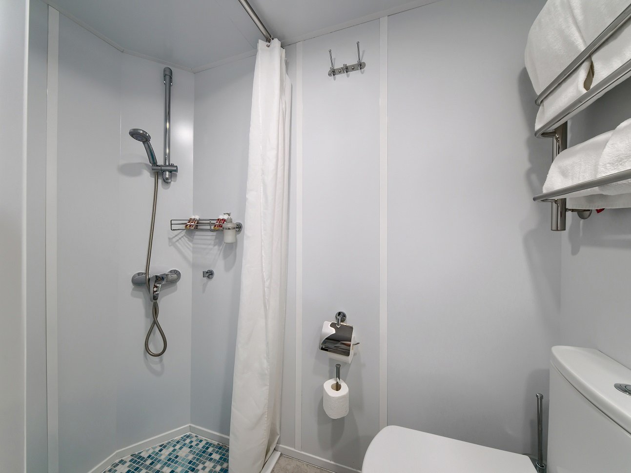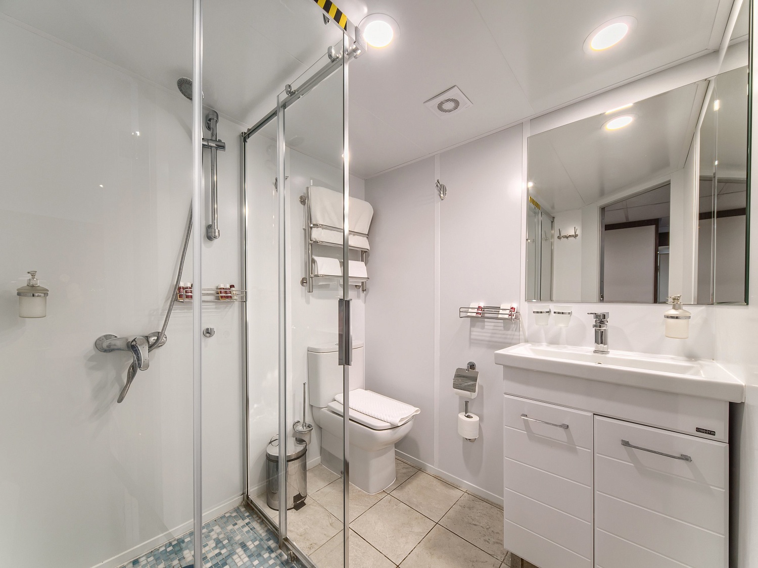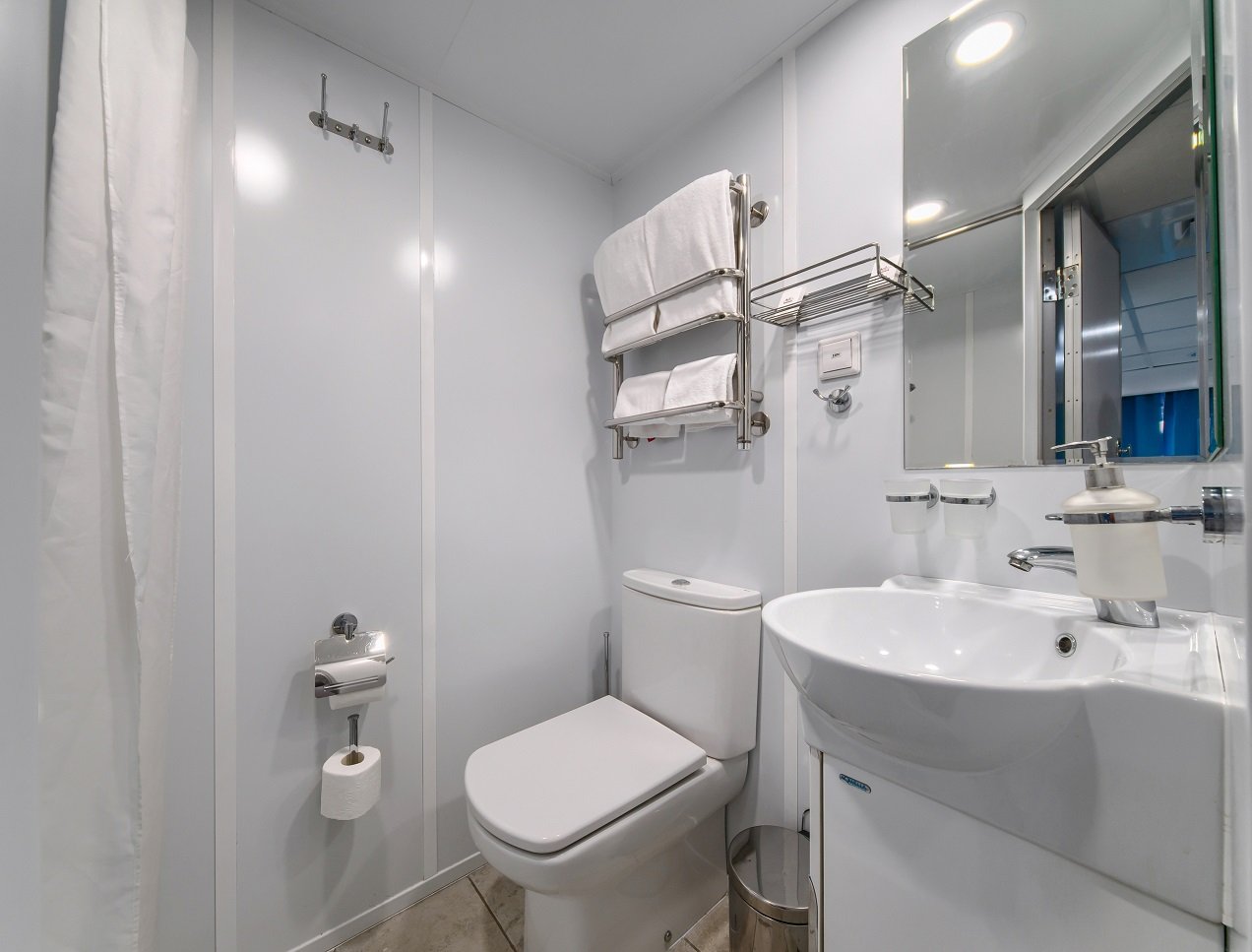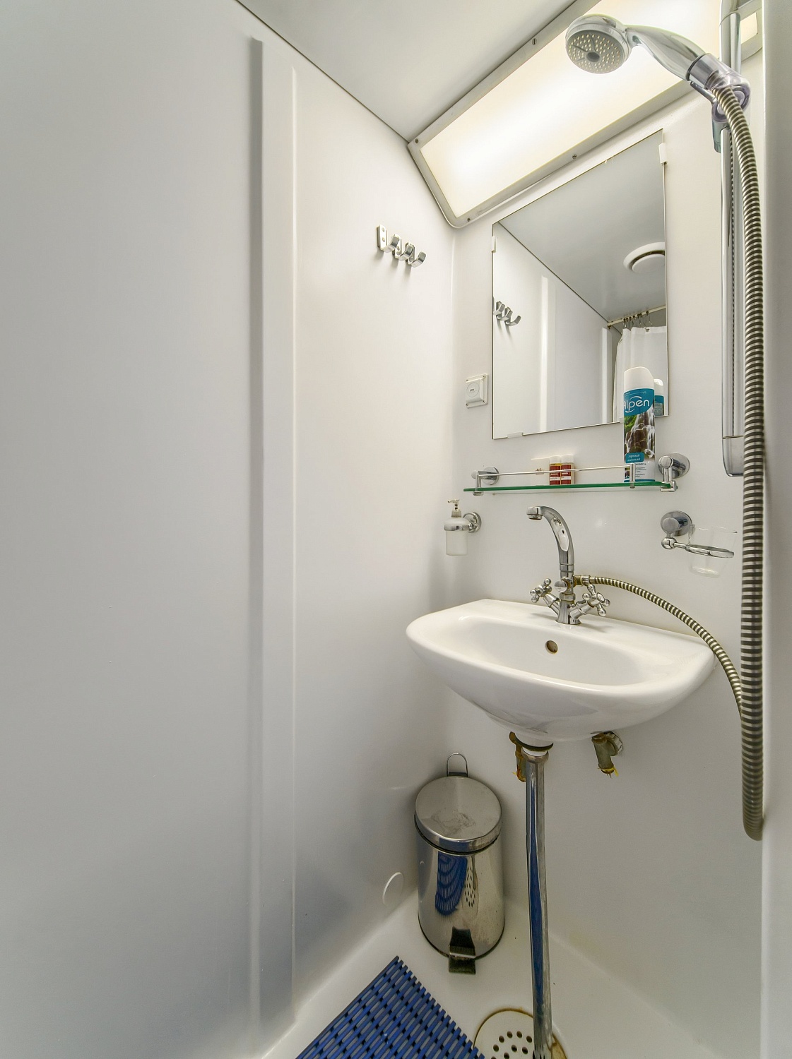 В каюте: одно спальное место, шкаф для одежды, радио, телевизор, холодильник, сейф, фен, душ, санузел, кондиционер, обзорное окно, электророзетка на 220V.