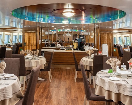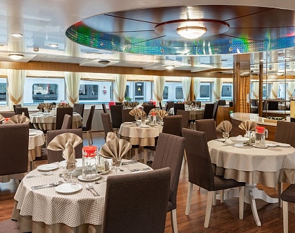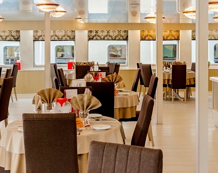 - Полный пансион (завтрак + обед + ужин): завтрак — шведский стол или заказная система с элементами шведского стола, фиксированная рассадка. Включённые напитки (без ограничения): вода*, сок, чай, кофе; обед — заказная система питания (выбор блюд со 2-го дня круиза), фиксированная рассадка. Включённые напитки (без ограничения): вода*, чай, кофе, морс (порционно); ужин — заказная система питания (выбор блюд со 2-го дня круиза), фиксированная рассадка. Включённые напитки (без ограничения): вода*, чай, кофе, кисломолочный продукт (1 стакан, 200 мл); порционно на выбор - вино красное / белое / игристое (1 бокал, 125 мл) / водка (1 рюмка, 50 мл) / пиво (1 бокал, 300 мл) / домашний морс (1 бокал, 200 мл).