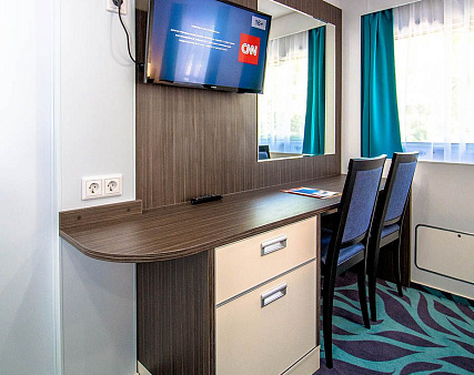 В каюте: две односпальные (сдвинуть нельзя) кровати, шкаф для одежды, трюмо, телевизор, холодильник, сейф, фен, радио, одно обзорное окно, электророзетка на 220V.