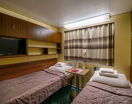 Возможна продажа каюты в трех- и двухместном размещении по стоимости трехместной двухъярусной и двухместной одноярусной каюты.