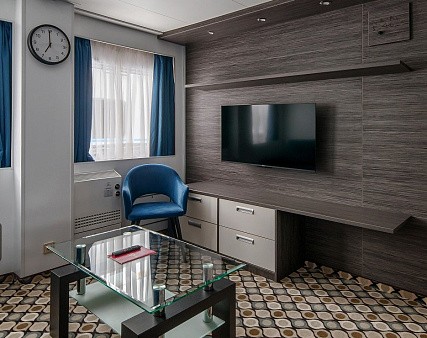 Комфортабельная гостиная с современным интерьером, мягкая мебель (два кресла, раскладывающийся на двух человек диван), журнальный столик, шкаф-стенка, кондиционер, радио, телевизор, холодильник, фен, сейф, два обзорных окна, электророзетка на 220V.