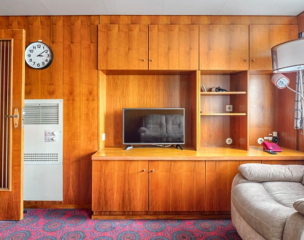 Двухкомнатная каюта с удобствами (душ, санузел, кондиционер). Каюта рассчитана на размещение от двух до четырех человек. В гостиной: мягкая мебель (кресло, раскладывающийся диван), журнальный столик, шкаф-стенка, телевизор, холодильник, фен, радио, мини-кухня, два обзорных окна, электророзетка на 220V. В спальне: двуспальная кровать, обзорное окно.