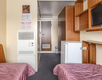 В каюте: одно спальное место, шкаф для одежды, холодильник, телевизор, фен, радио, душ, санузел, кондиционер, обзорное окно, электророзетка на 220V. Площадь каюты: №437 - №440 - 6,6 кв.м., №441 - №446 - 7,83 кв.м.