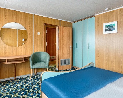 В каюте: двуспальная кровать, одно спальное место вторым ярусом, два шкафа для одежды, зеркало, телевизор, холодильник, радио, фен, два обзорных окна, электророзетка на 220V.