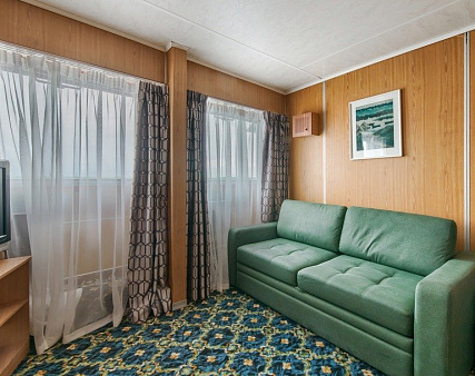 В каюте: два дивана-книжки (раскладываются), два спальных места вторым ярусом, два шкафа для одежды, зеркало, телевизор, холодильник, радио, фен, два обзорных окна, электророзетка на 220V.