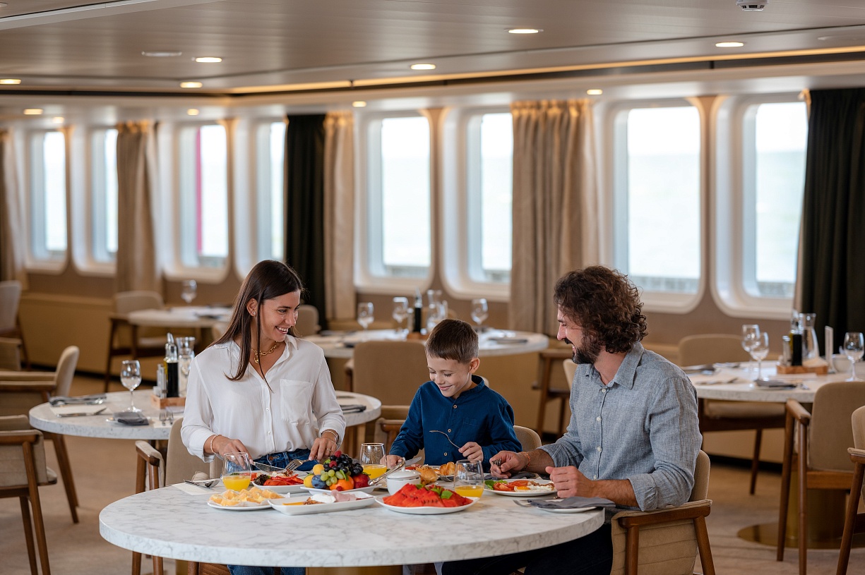 • Обед — заказная система питания (выбор блюд со 2-го дня круиза) с элементами шведского стола (десерт, фрукты, морсы), фиксированная рассадка. Включённые напитки (без ограничения): вода, чай, кофе, домашний морс;
