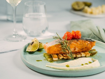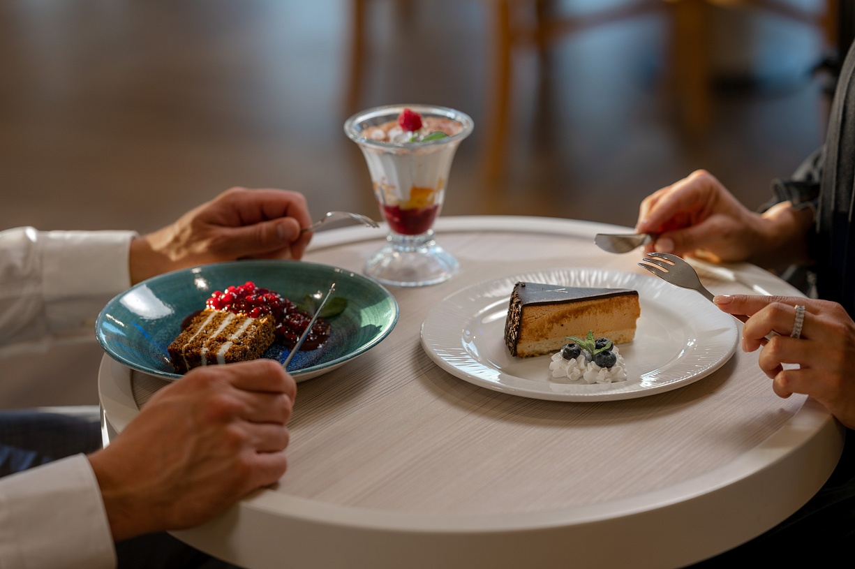 - Обед — заказная система питания (выбор блюд со 2-го дня круиза) с элементами шведского стола (десерт, фрукты, морсы), фиксированная рассадка. Включённые напитки (без ограничения): вода, чай, кофе, домашний морс;