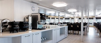 - Обед – заказная система питания (выбор блюд со 2-го дня круиза). Включенные напитки (без ограничения): чай, кофе. Фиксированная рассадка;