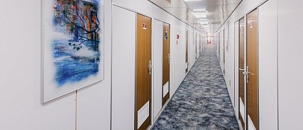 Расширена площадь санблока, отдельный душ, санузел, кондиционер. Площадь каюты — 26 кв.м.
