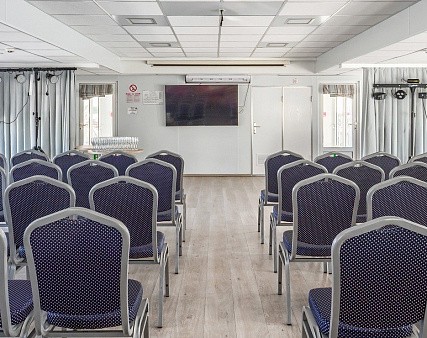 В каюте: три спальных места (два внизу, одно — вторым ярусом), шкаф для одежды, трюмо, радио, телевизор, фен, холодильник, сейф, два иллюминатора, электророзетка на 220V.