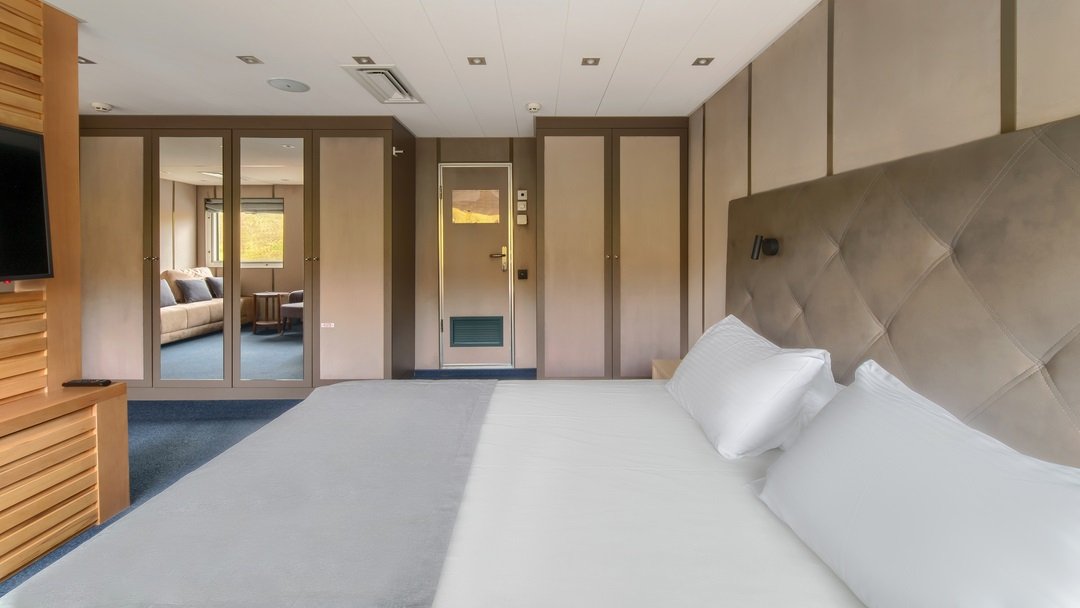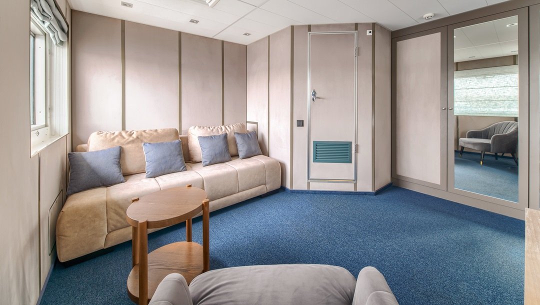 В каюте: двуспальная кровать, диван, кресло, шкаф для одежды, журнальный стол, телевизор, холодильник, фен, радио, сейф, четыре обзорных окна, электророзетка на 220V.