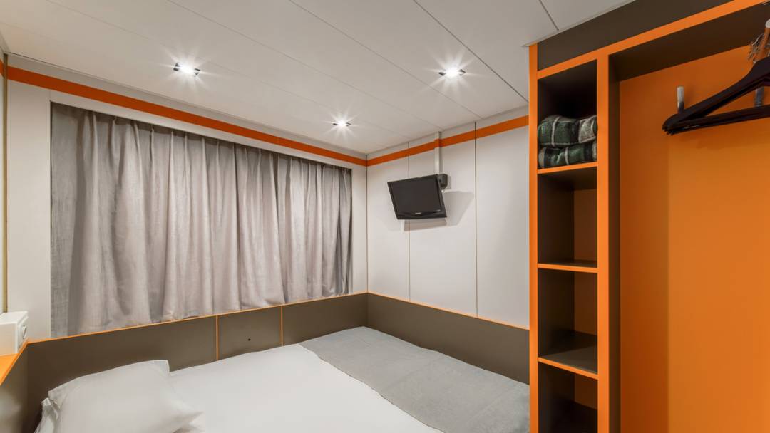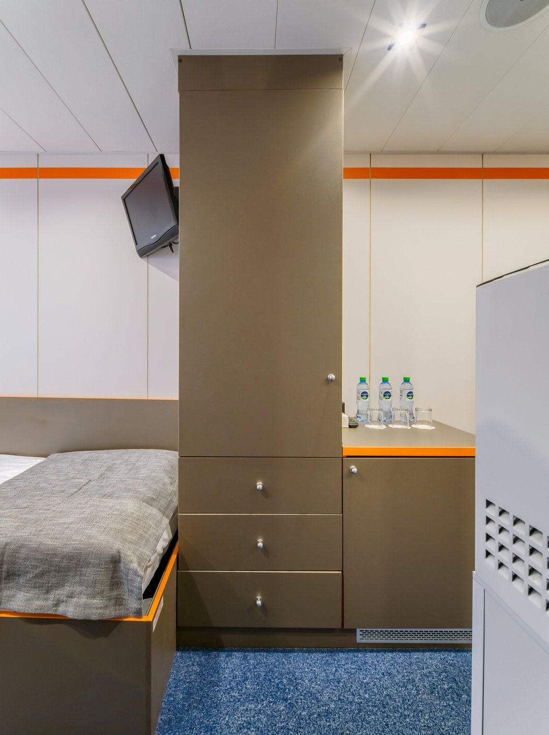 В каюте три спальных места, шкаф для одежды, холодильник, телевизор, радио, сейф, душ, санузел, кондиционер, фен, два иллюминатора, электророзетка на 220V.