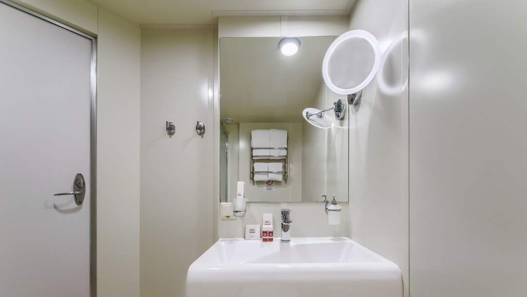В каюте: двуспальная либо две односпальные кровати, холодильник, телевизор, шкаф для одежды, радио, сейф, обзорное окно, душ, санузел, кондиционер, фен, электророзетка на 220V.