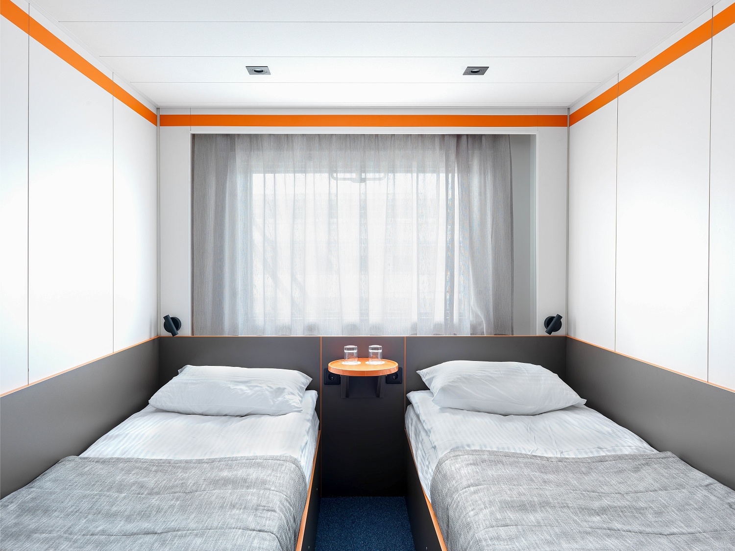 В каютах 201-224 (главная палуба) — две односпальные кровати размером 80х185 см, площадь каюты 13,2 м2.