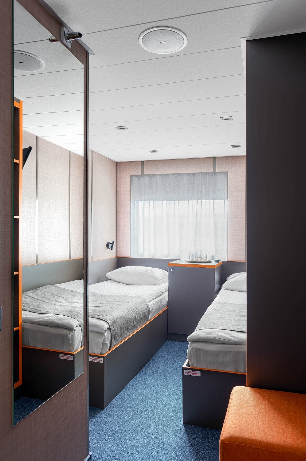 В каютах 401, 402, 404, 410, 411, 431-434 (шлюпочная палуба), 319-322, 339, 340, 345, 346, 365, 366, 369, 370 (средняя палуба) — две односпальные кровати размером 80х180 см, площадь каюты 10 м2