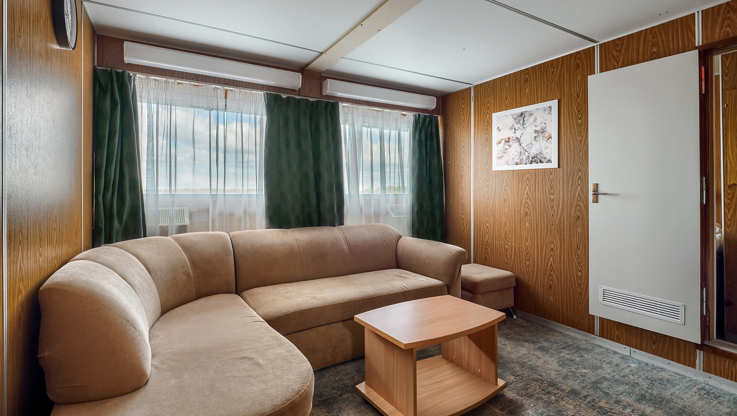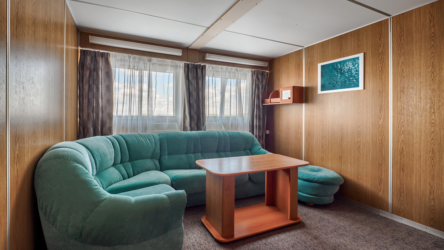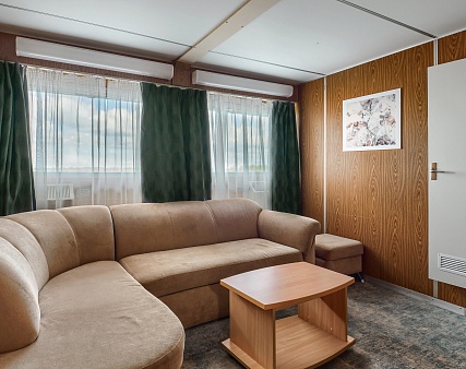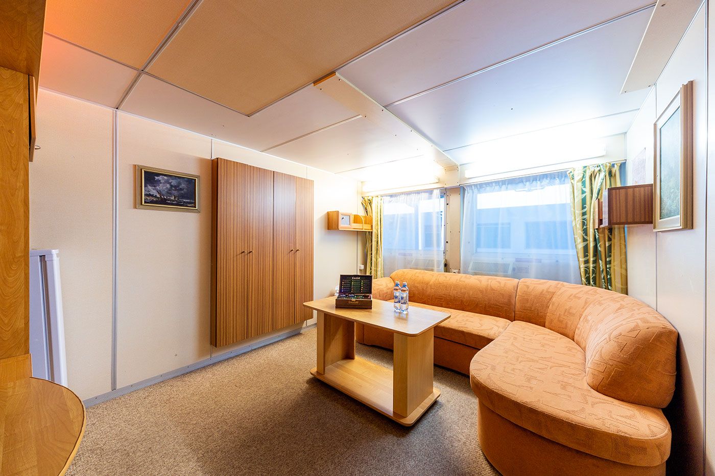 Площадь каюты 28 м2 (спальня — 14 м2, гостиная — 14 м2).