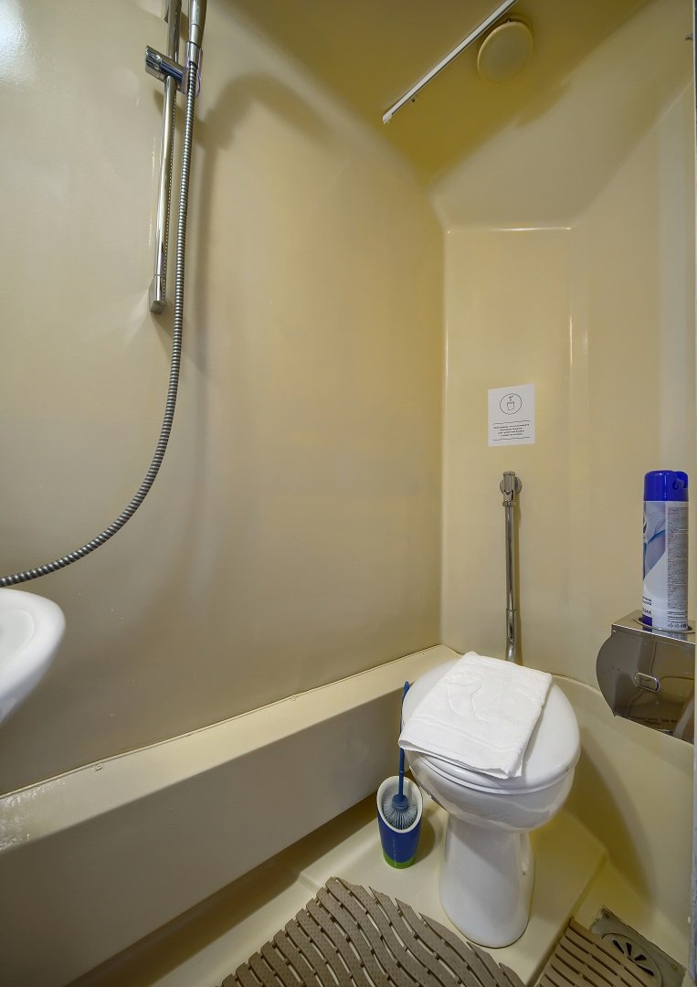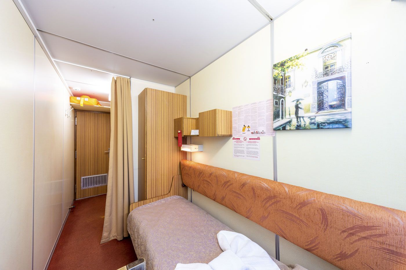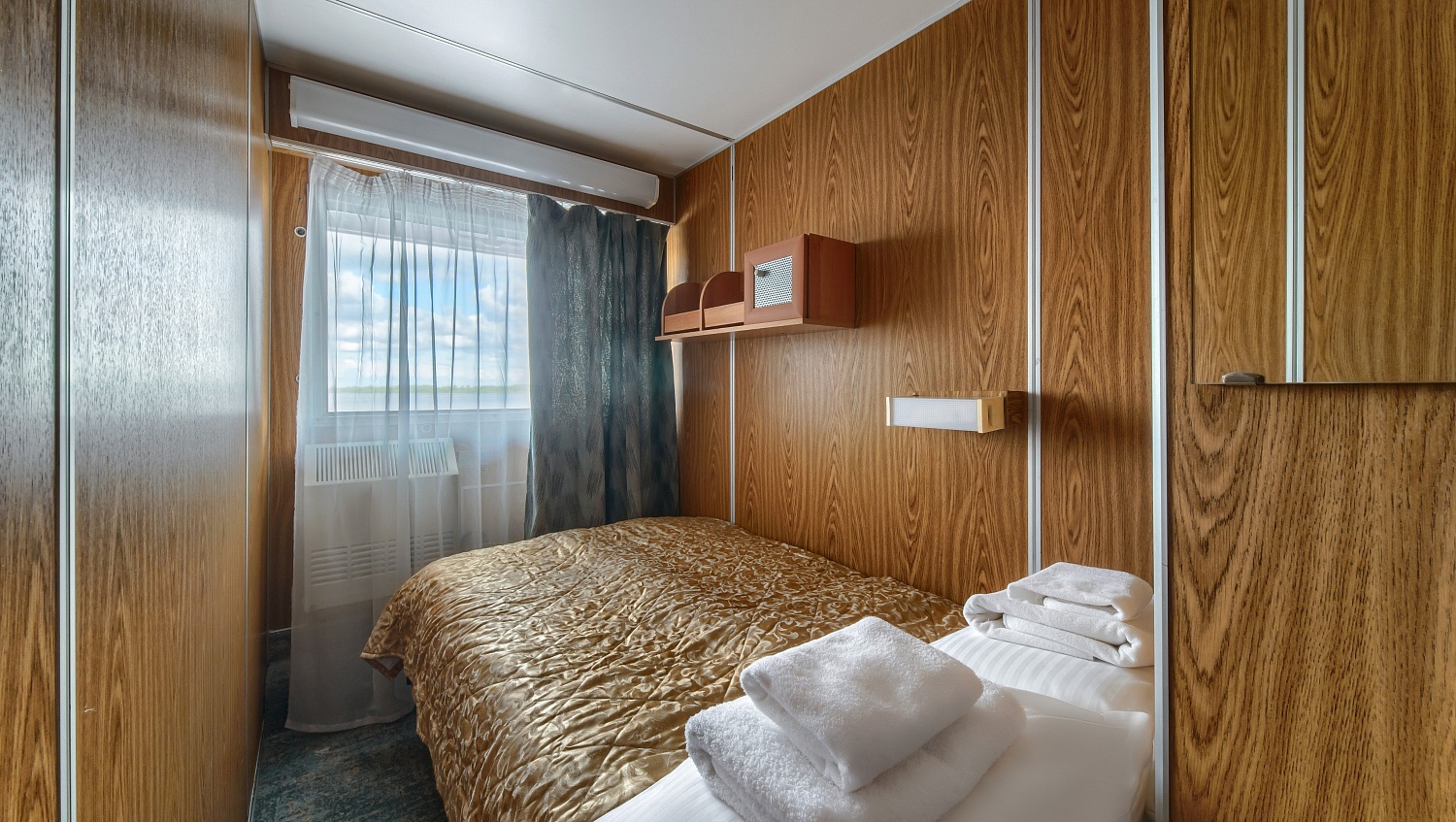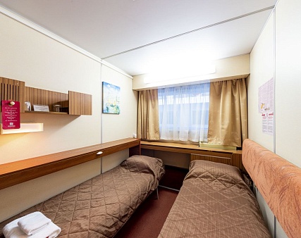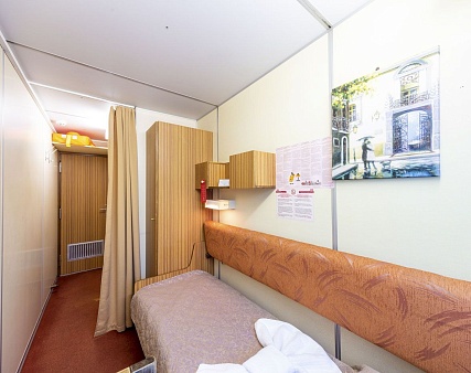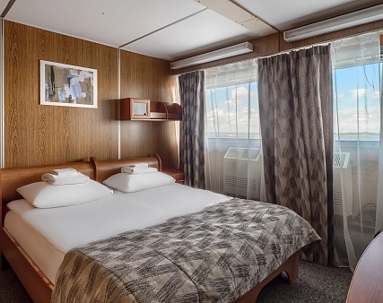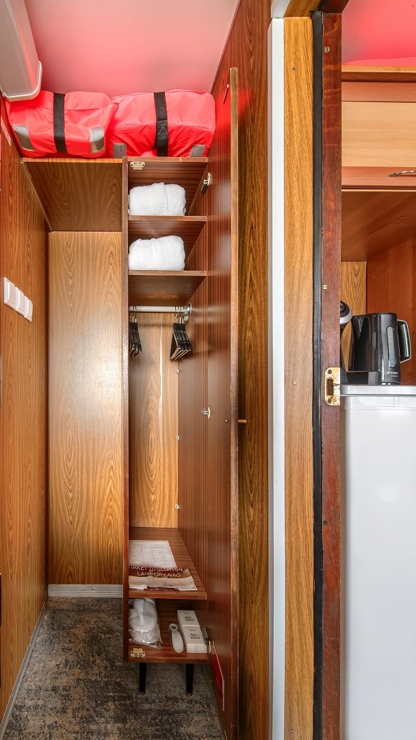 В каюте: одно спальное место, шкаф для одежды, зеркало, радио, душ, санузел, кондиционер, обзорное окно, электророзетка на 220V.