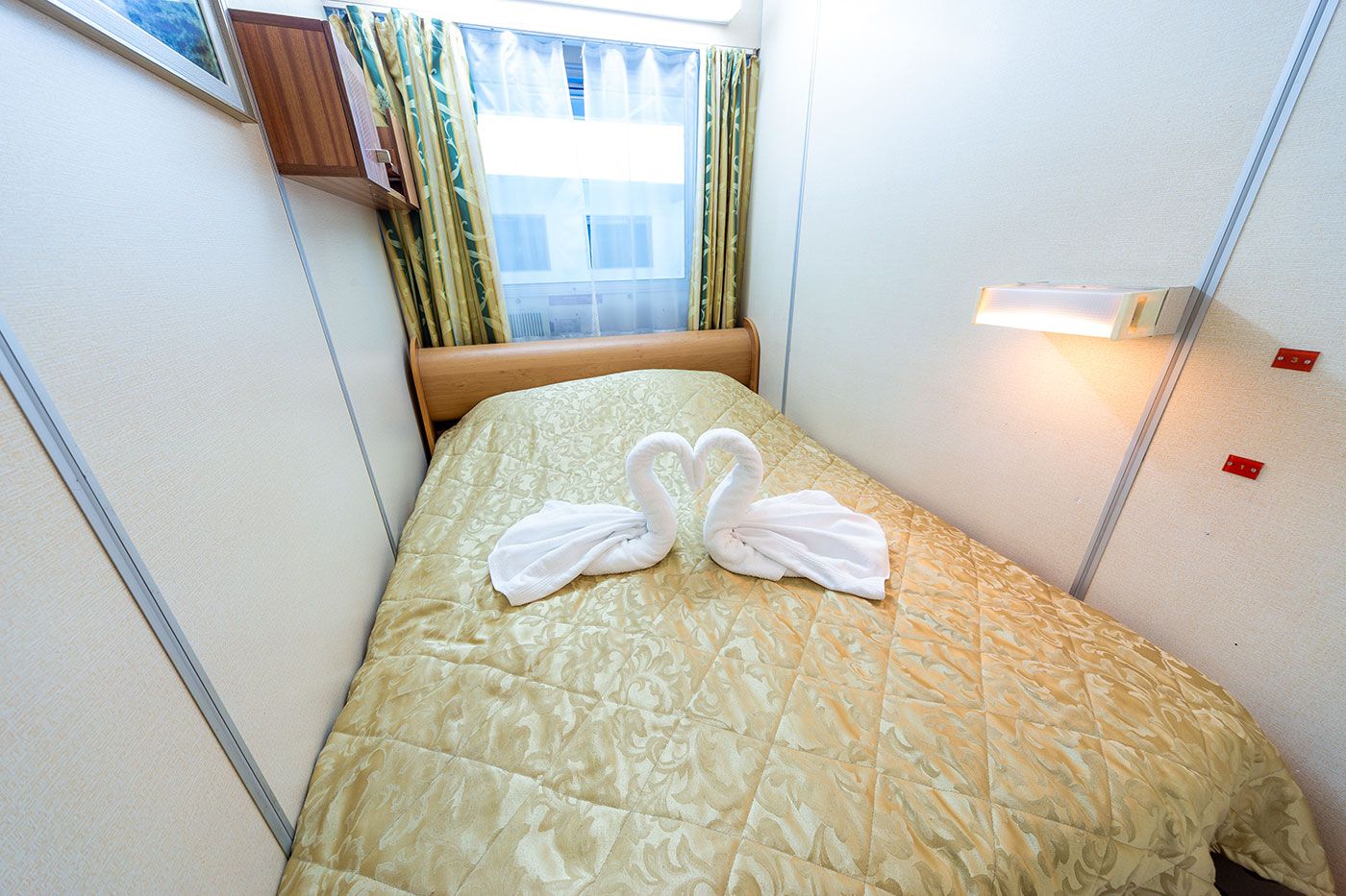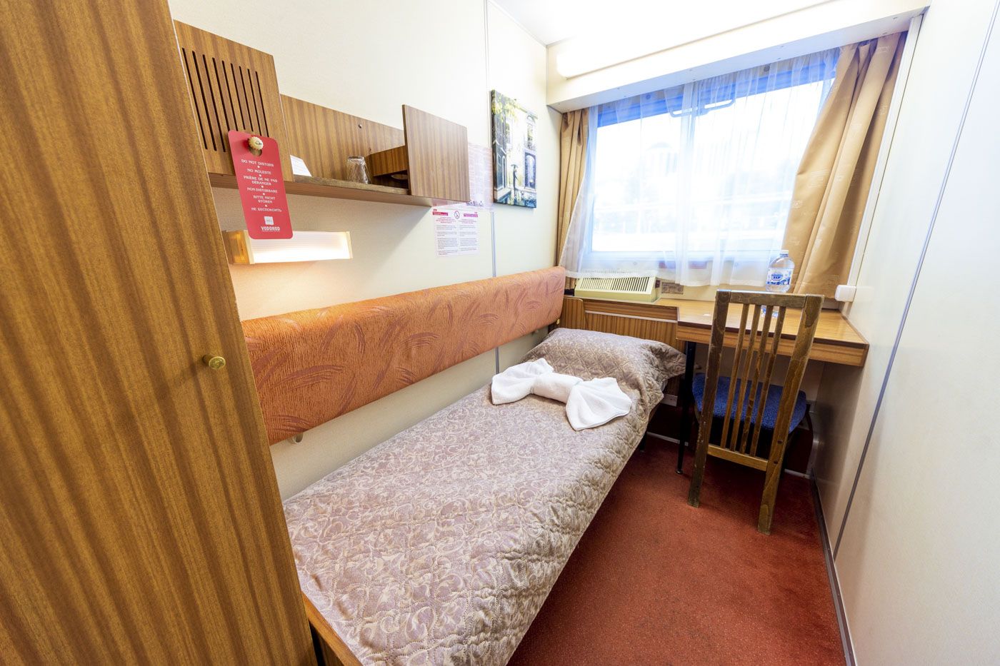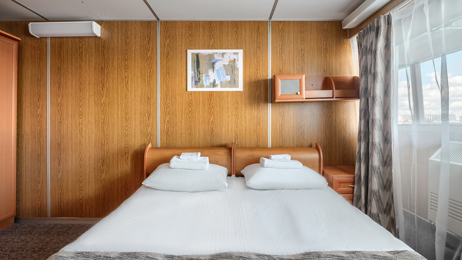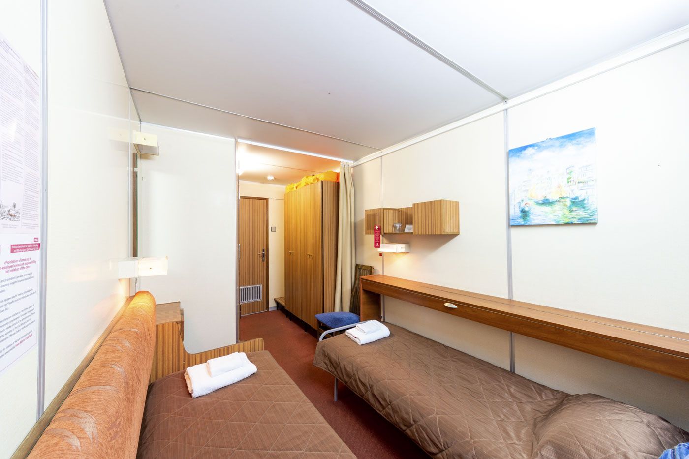 В каюте: одно спальное место, шкаф для одежды, зеркало, радио, душ, санузел, кондиционер, обзорное окно, электророзетка на 220V.