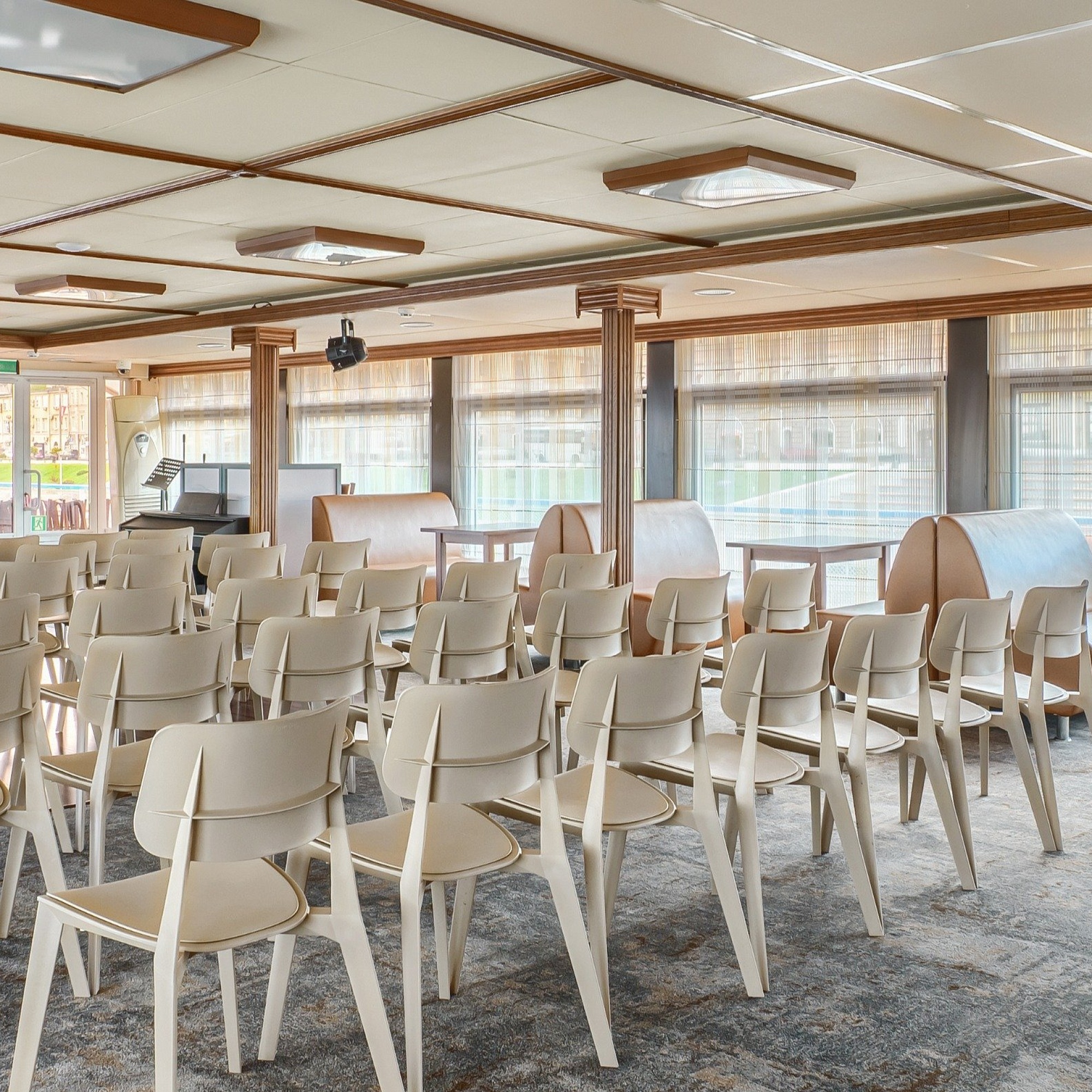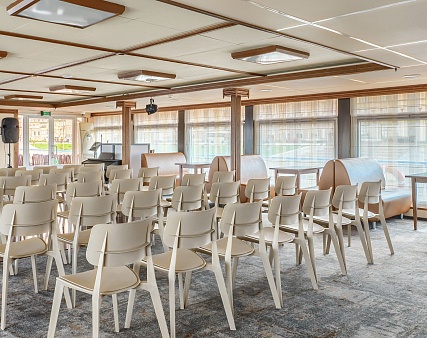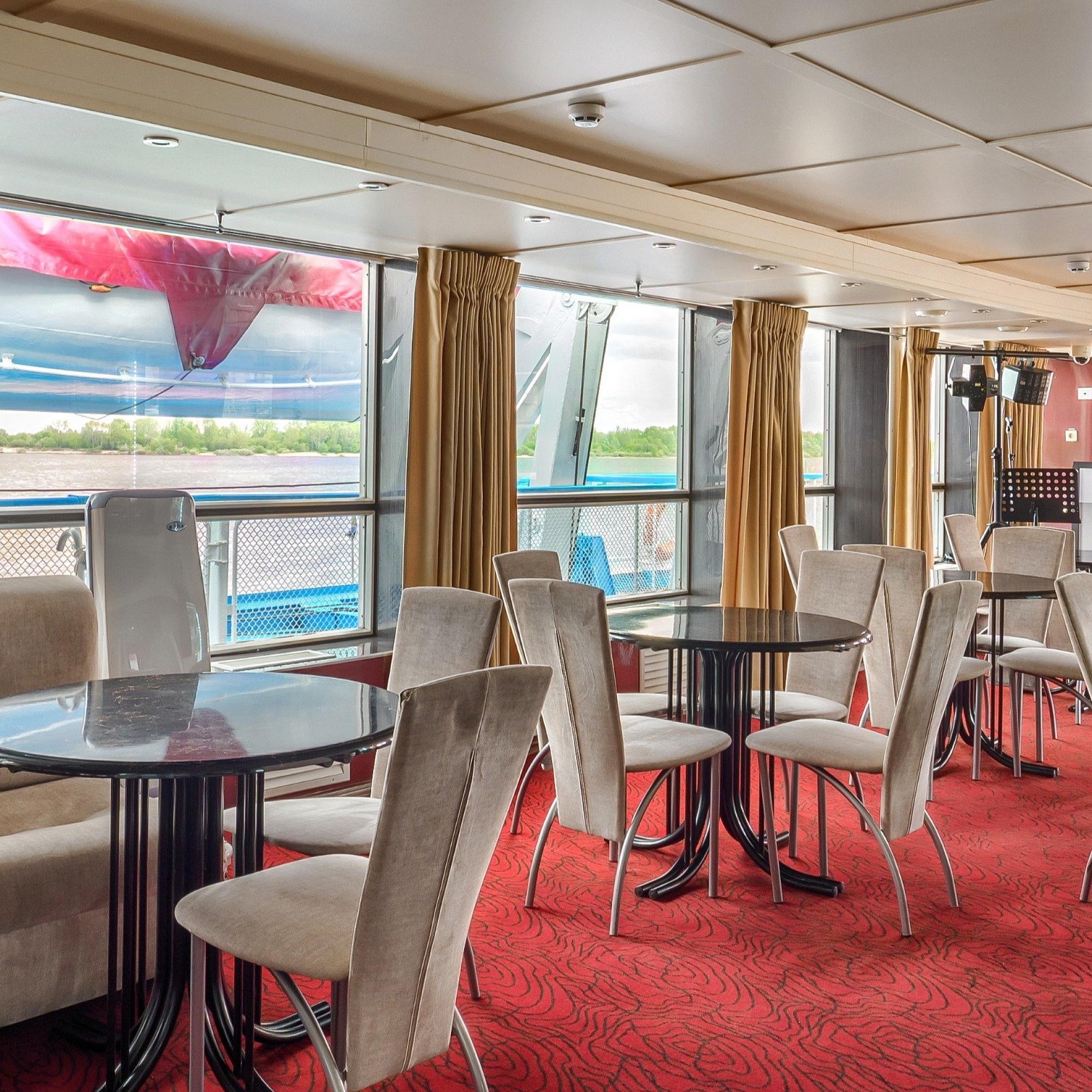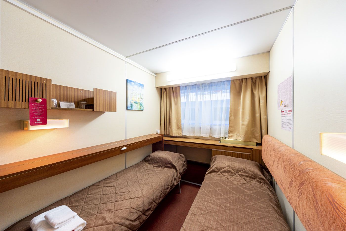 В каюте: одно спальное место, шкаф для одежды, зеркало, радио, душ, санузел, кондиционер, обзорное окно, электророзетка на 220V.